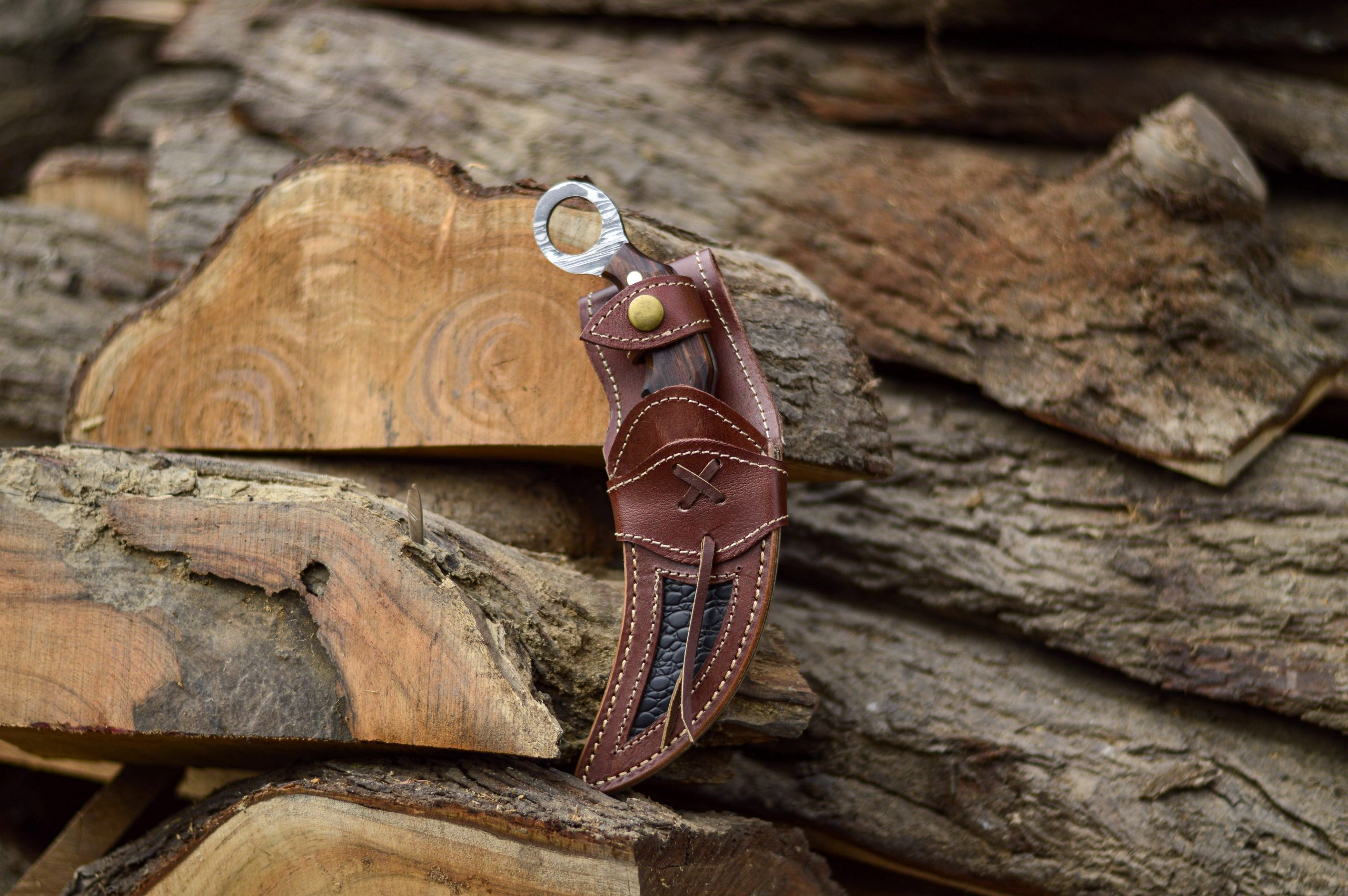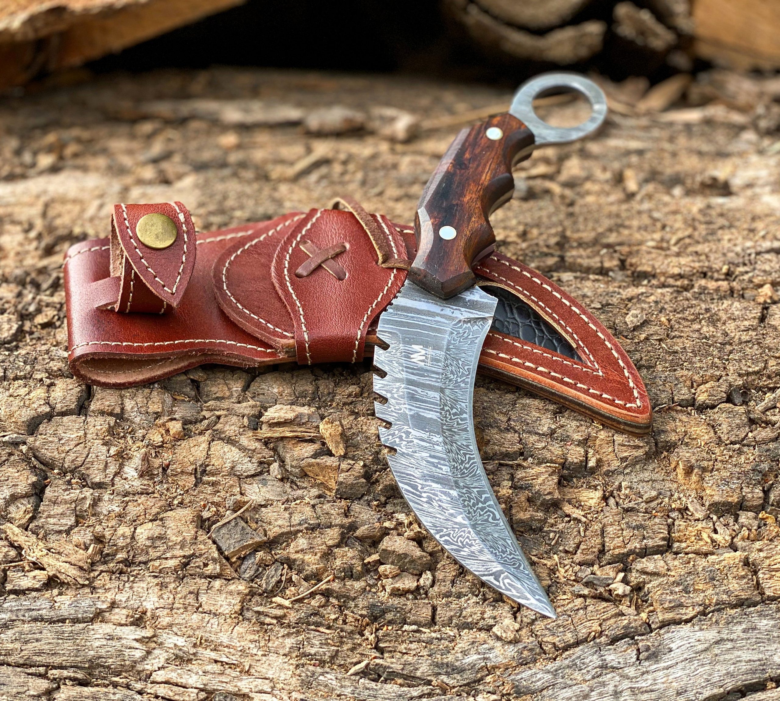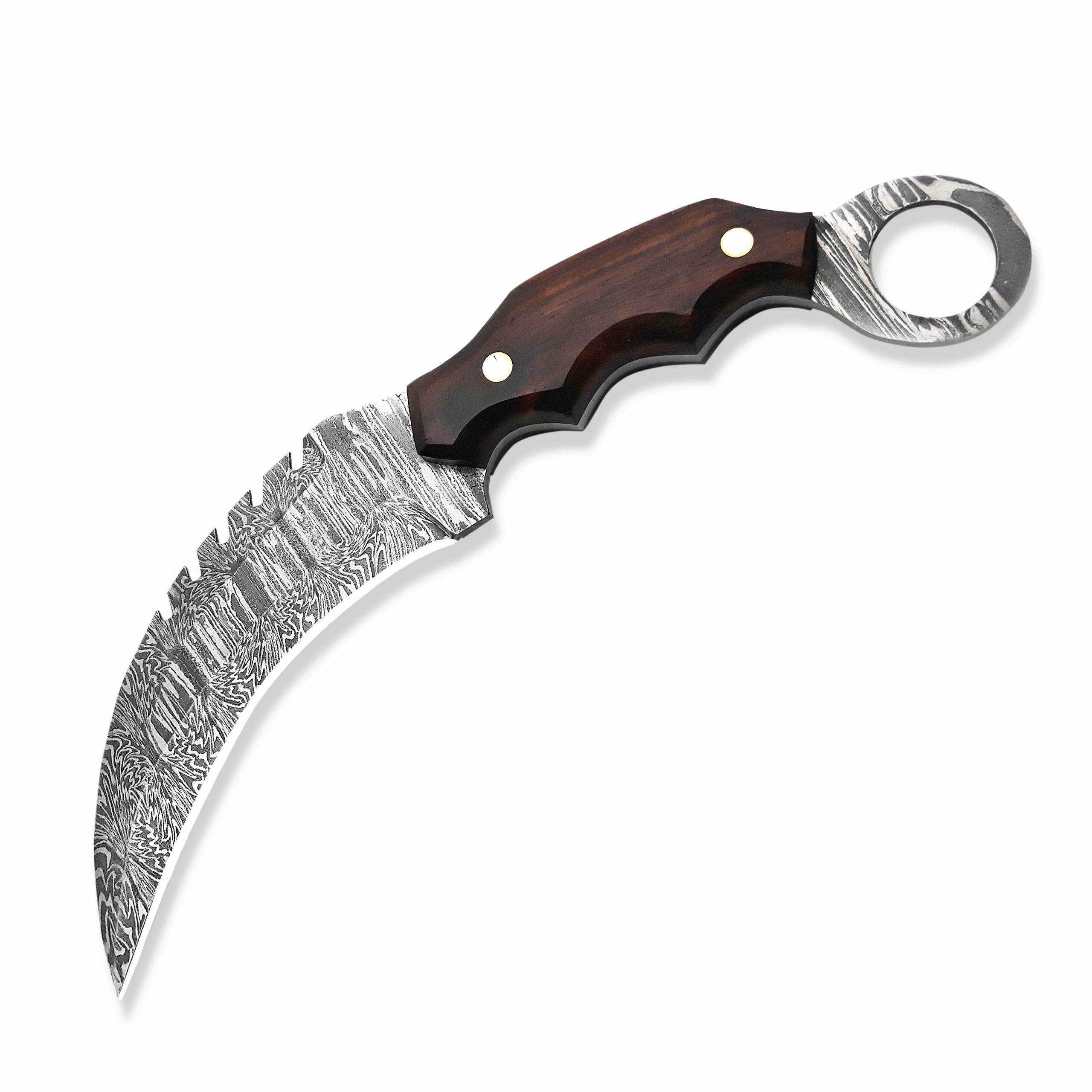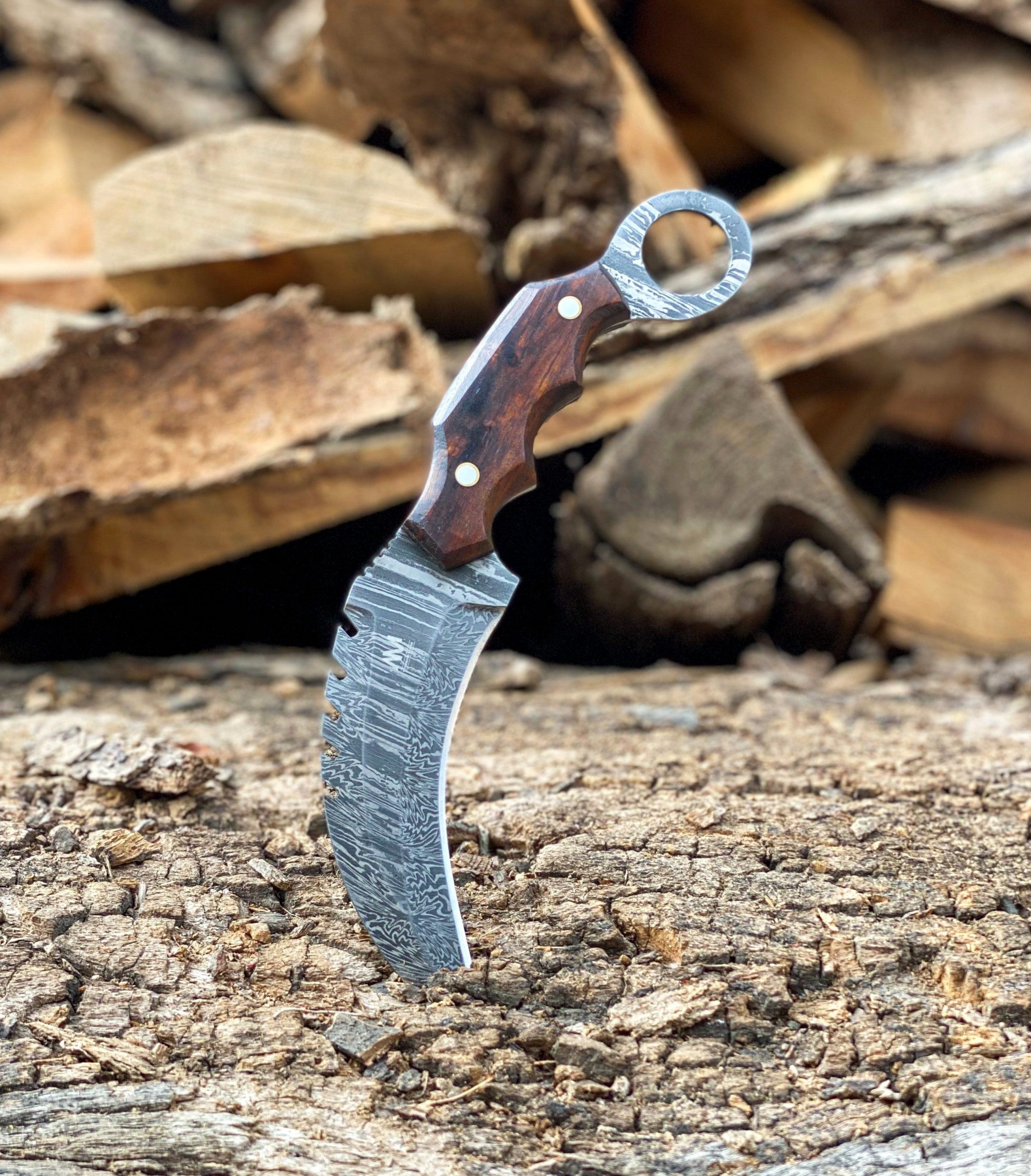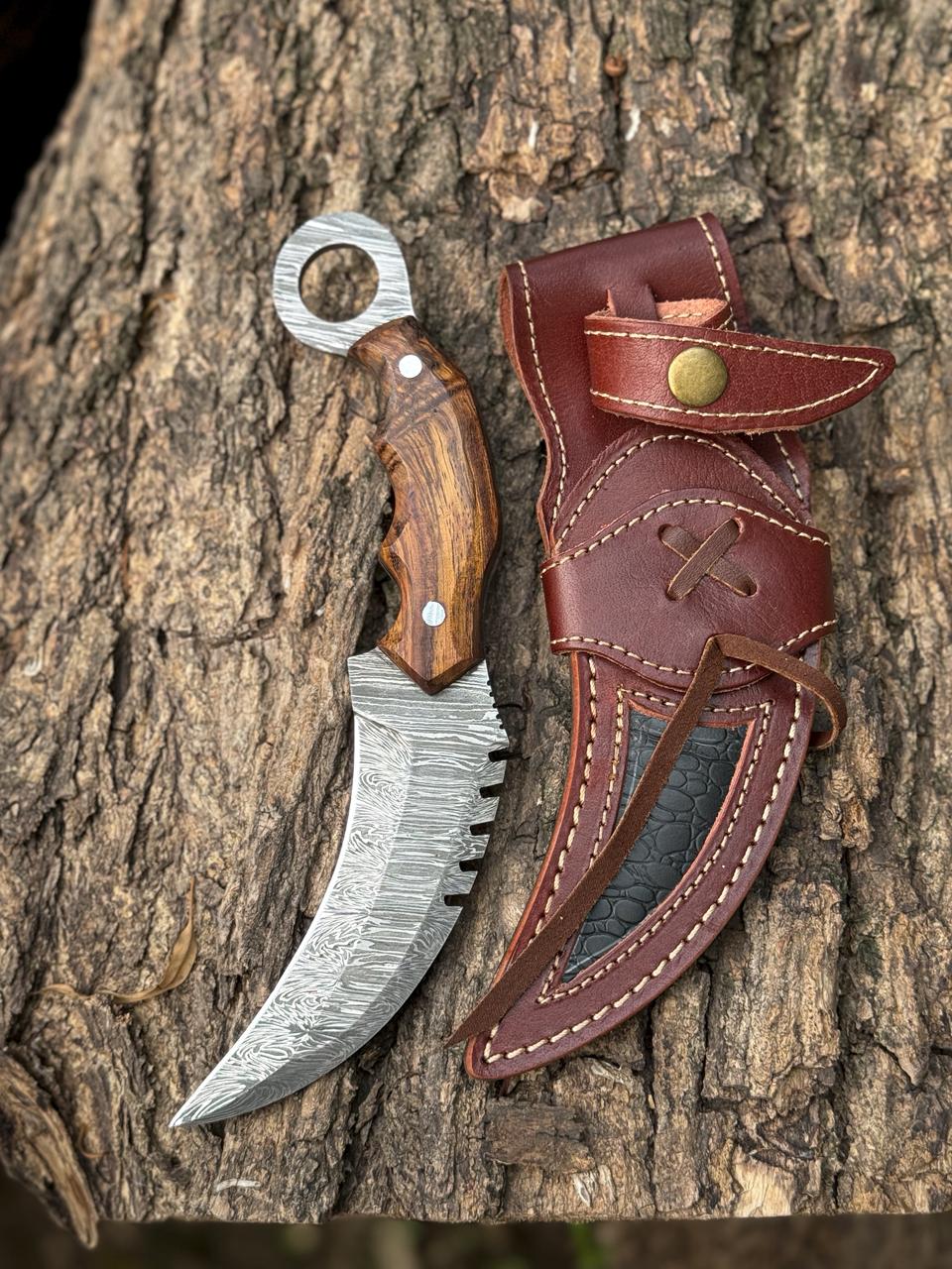 The AM Reaperclaw is a fearsome fusion of elegance and lethality. Forged from high-quality Damascus steel, its talon-shaped blade delivers devastating slicing power, making it ideal for tactical use, self-defense, and display. The aggressive curve is matched with precision jimping for control, while the deep finger grooves and rich hardwood scales ensure a secure, comfortable grip. A rear finger ring enhances retention and maneuverability in any situation. With its intricate Damascus patterns and menacing profile, the Reaperclaw is a true statement piece for serious knife collectors and operators.