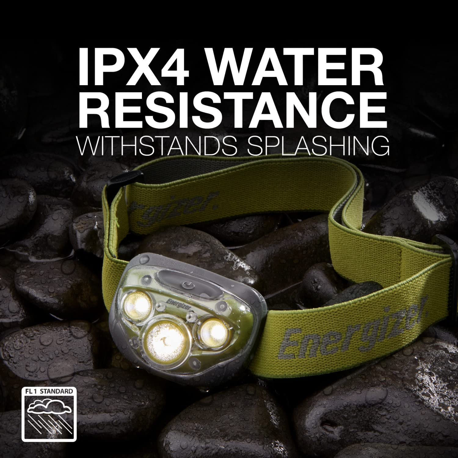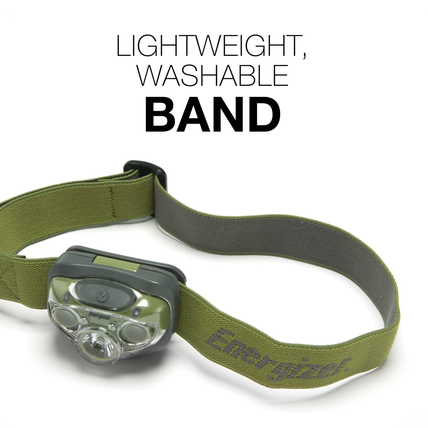Details: The Energizer Vision HD+ Forest Green LED Headlamp is ready to shine while leaving both hands free, no matter what the situation. Unleash the maximum power of 260 lumens on high mode for an 80-meter beam distance to illuminate even the darkest areas. Additional light settings—including high and low spot, high and low wide, low, and red for night vision—let you customize this lightweight headlamp to fit your needs. Next Push Off technology makes this light easy to switch on and off. Powered by three AAA alkaline batteries (included), this battery-powered headlamp with the best batteries runs for up to four hours on high. A pivoting head lets you direct the beam right where you need it most, while an adjustable head strap secures this hands-free LED light comfortably on your head. Designed for durability, this IPX4 water-resistant headlamp withstands splashes, has a shatterproof lens, and is impact-resistant up to 1 meter. Count on Energizer to provide bright, reliable emergency flashlights for any situation.