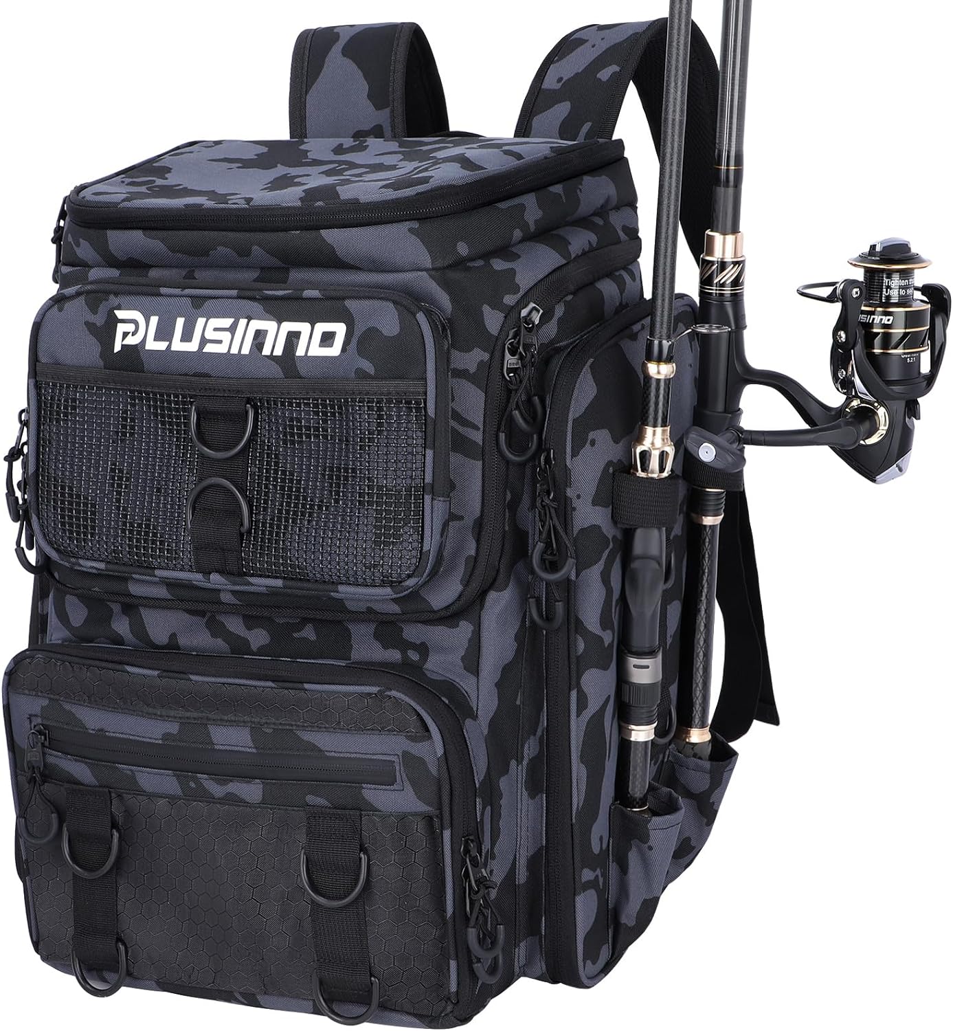 - WATER RESISTANT & STURDY – PLUSINNO fishing backpack with rod holders is made of durable high density 900D polyester fabric for superior long-term performance and reliability, which can protect all your fishing gear and tackle from damage. The waterproof coating ensures that your belongings stay dry. Sturdy zipper construction ensures easy access to every pocket. The strong X-shaped stitching on the shoulder straps and backpack connection, which allow you to carry the fishing bag more securely.