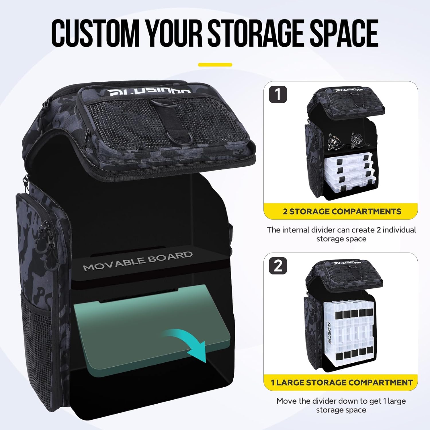 - Customize Your Main Compartment: This fishing tackle backpack has a large capacity main compartment, adjustable with a movable padded partition. You can fold it to get a large storage space, the size is 12 x 8.5 x 16 inches, which can hold large tackle boxes. For more effective use with different fishing gear, simply move the divider to the center and clip it into place to create two individual storage spaces.