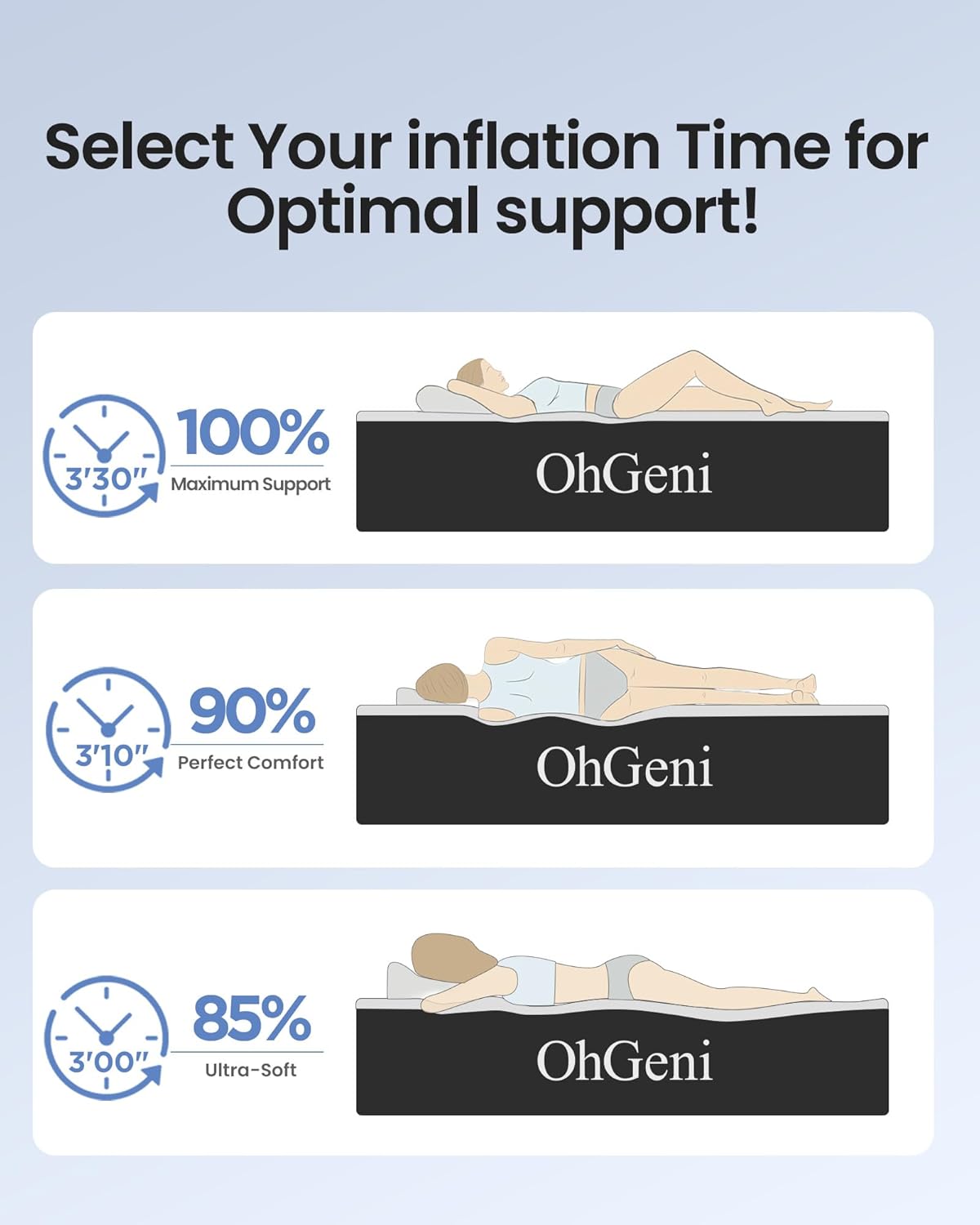 - Inflatable 𝐂𝐨𝐦𝐟𝐨𝐫𝐭: Experience fast, firm support with the OhGeni air mattress, which inflates with 110V or deflates in just 3 minutes. Its smart Air Coil System adapts to your body’s natural contours, distributing weight evenly to prevent sinking and reduce pressure on your back.