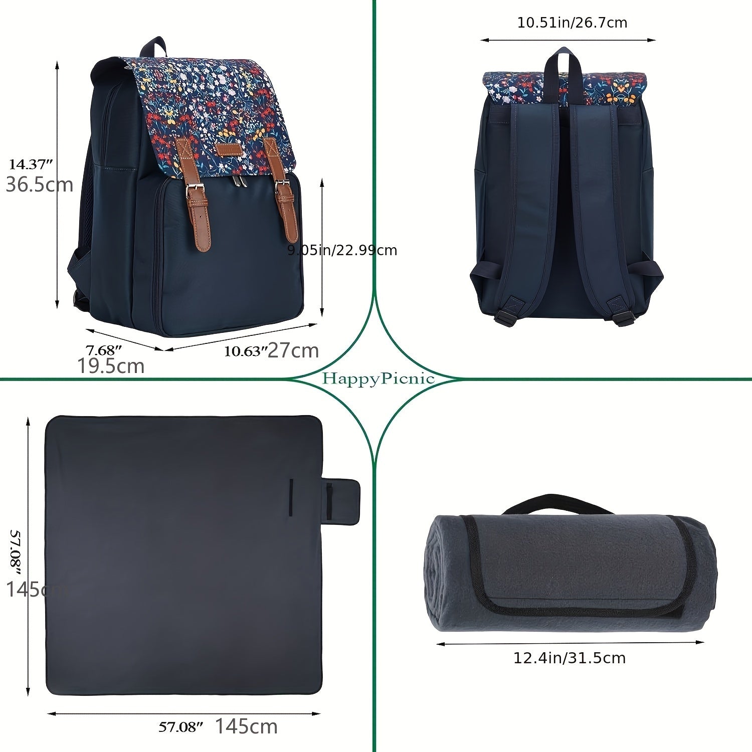 Elevate your outdoor adventures with the Insulated Picnic Backpack Set, designed to make every picnic effortless and organized. Whether you’re planning a beach day, BBQ, hike, or camping trip, this stylish blue floral backpack ensures you’re always prepared. The included blanket is sand-proof, waterproof, and easy to clean — making it perfect for both the outdoors and indoor floor use. Refer to the image for dimensions.