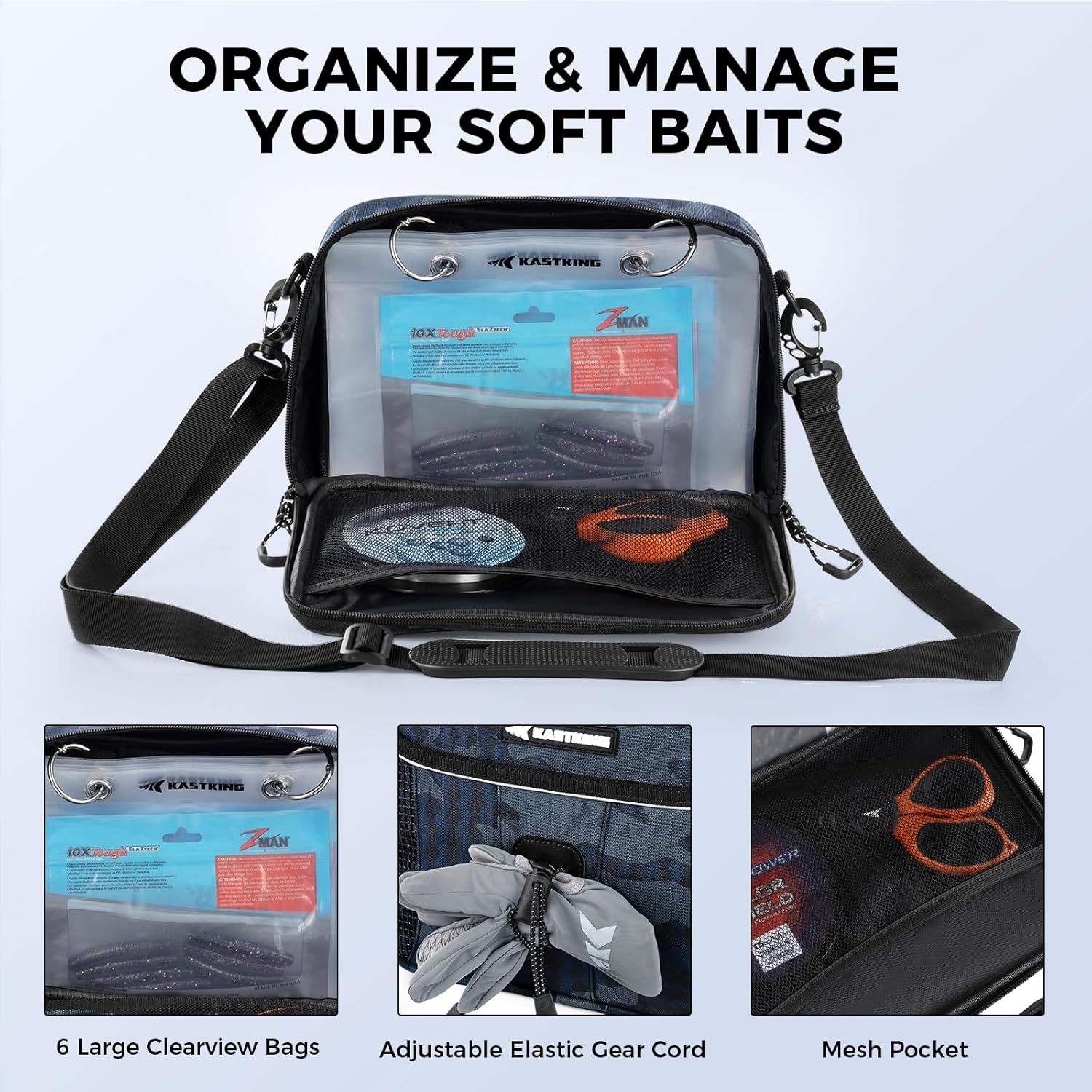 • Interchangeable Storage System: The KastKing Bait Space 50L Backpack comes with a removable soft bait binder bag that includes six clear-view sleeves (9.5” x 7.5”) for quick identification of your baits. This versatile system allows you to swap the binder bag for an optional lunch cooler or line spooling bag (both sold separately), making it adaptable to your fishing needs and lifestyle.