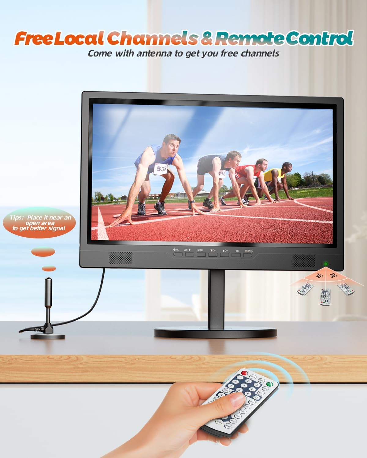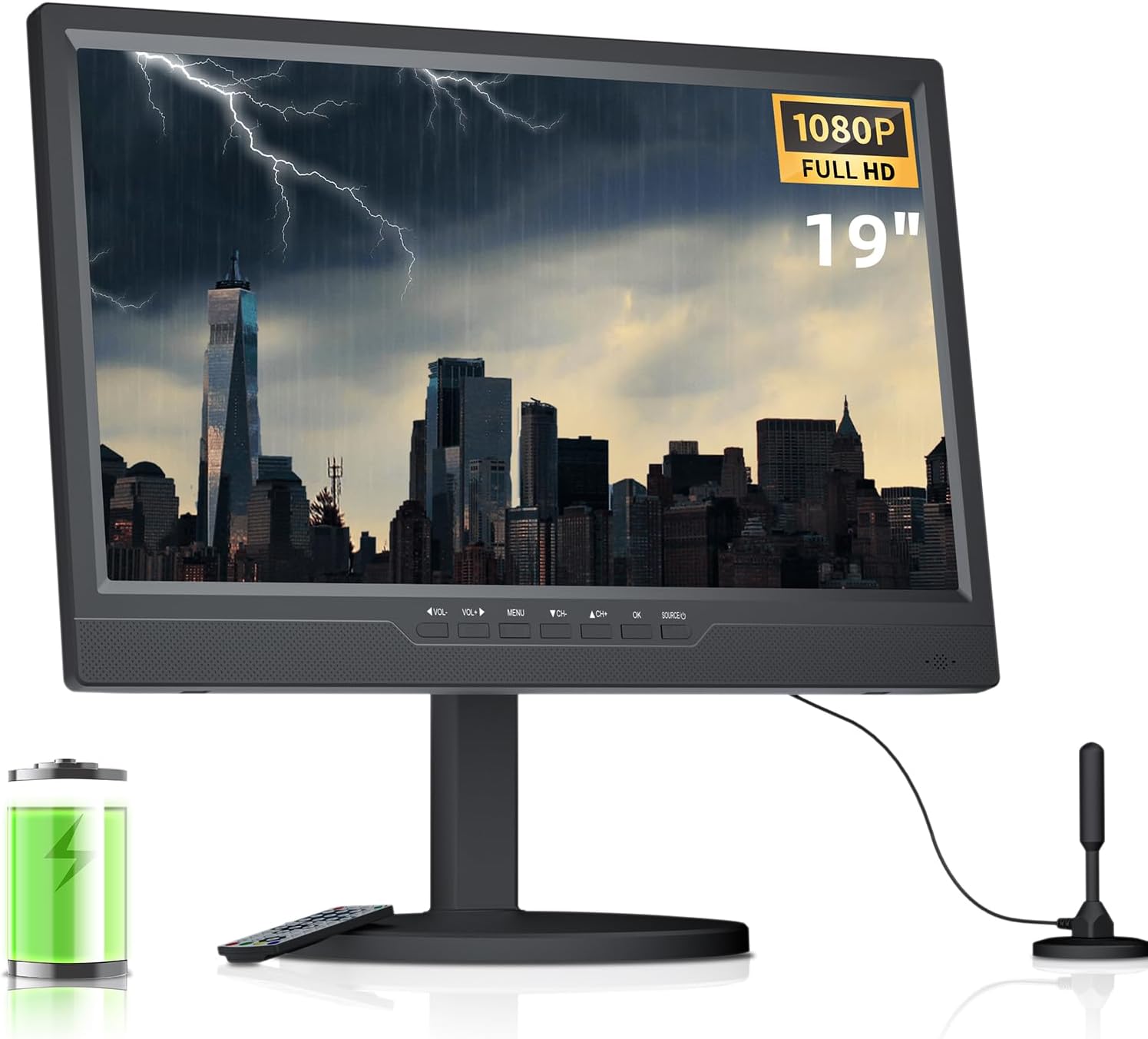 - 19.1 Inch Large Screen and Dual Speakers: Upgraded 19.1″ large screen and built-in dual speakers to enhance your viewing experience. Elevate your entertainment with the combination of an larger screen and dual speakers on this portable mini TV. Immerse yourself in crisp visuals and immersive sound
