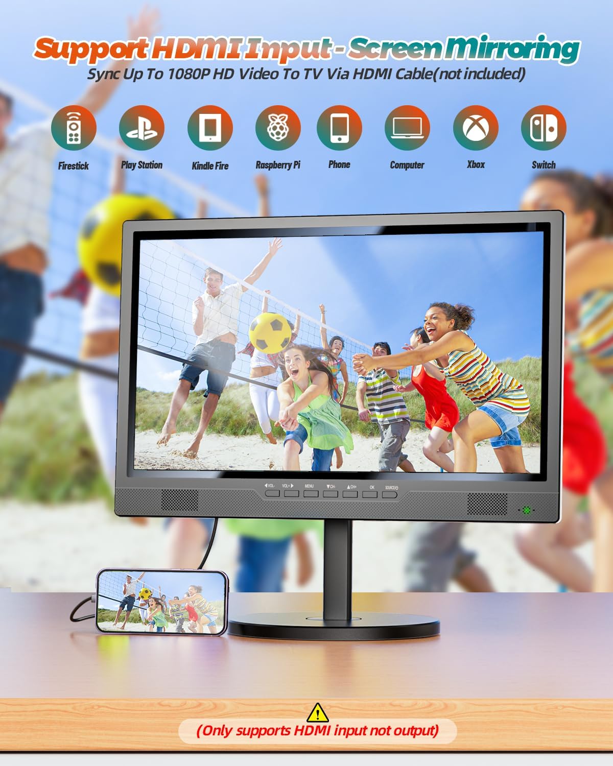 - HDMI Input and AV Input: Featuring HDMI and AV inputs, this portable mini TV offers enhanced compatibility with a wide range of devices.Sync up to HD 1080P video from your phone to this TV via HDMI cable (not included). You can also connect many other devices to this small TV, such as DVD player, TV sticks, Raspberry Pi, Xbox, game consoles,kindle fire, computer, camera,and more