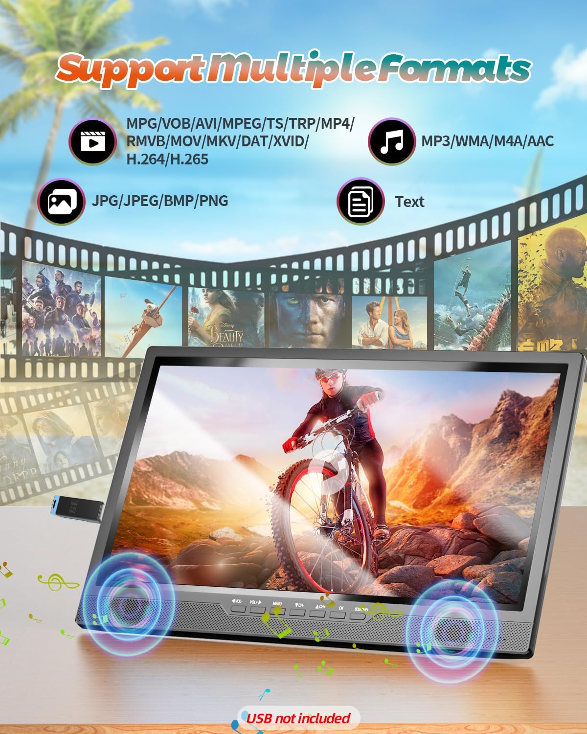 - USB and Support multiple formats: With USB-C port, this TV support and compatibility for multiple formats,such as MP4, AVI, MPG, MOV, MKV, TS, TRP, VOB, DAT, MPEG 1, MPEG 2, MPEG 4, XVID, H.264, H.265, MP3, WMA, M4A, AAC, JPG, JPEG, BMP, PNG, TEXT. This portable TV allows you to effortlessly enjoy your favorite content