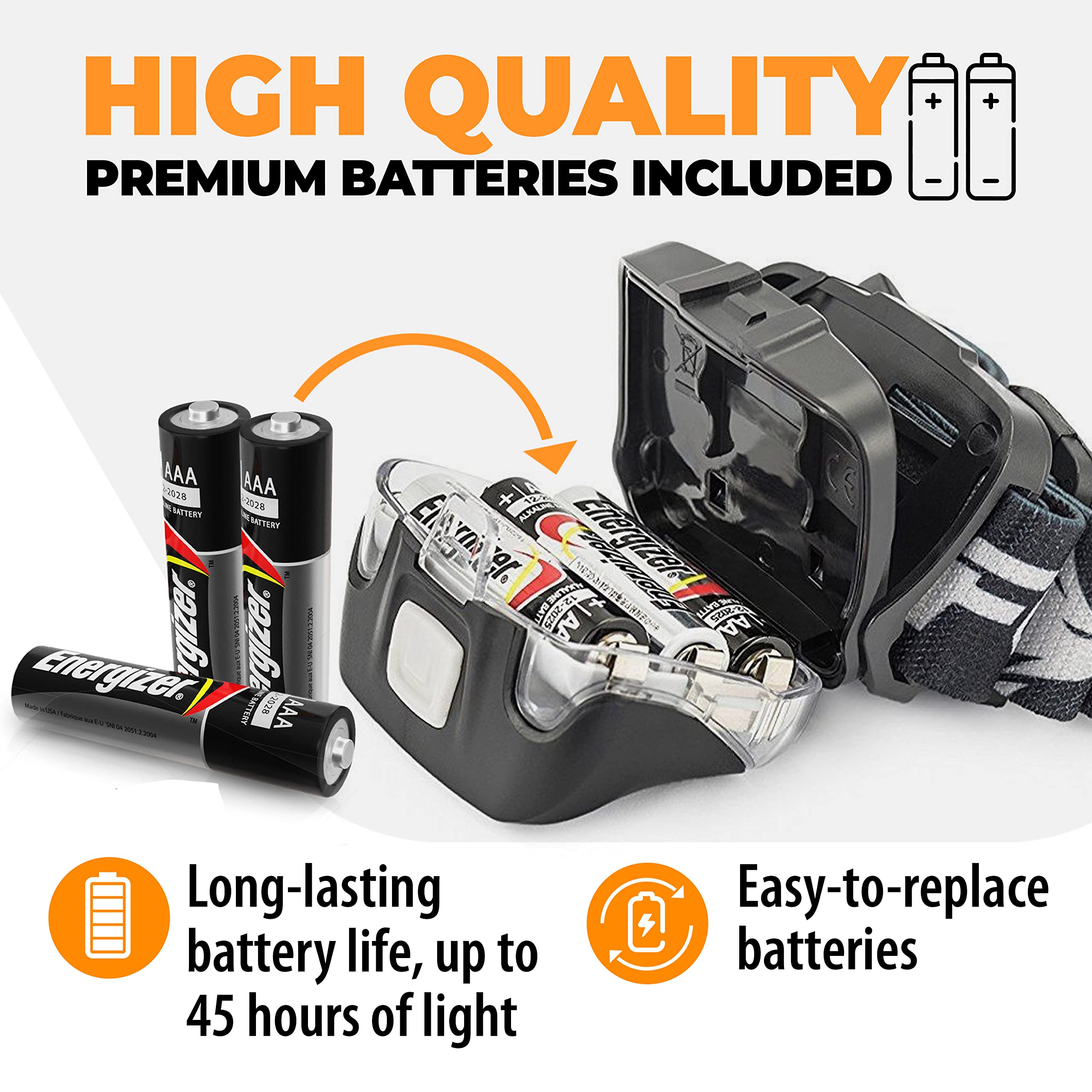 - SUPER LONG BATTERY LIFE—by using leading technology, MX20 provides more light with less power used, resulting in up to 45 hours of run-time. 3 AAA ENERGIZER batteries included. Each head torch has been tested for quality.