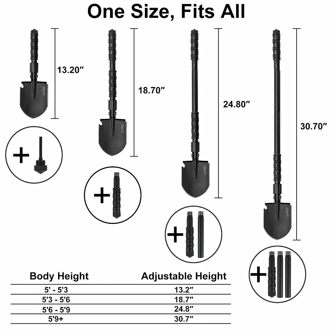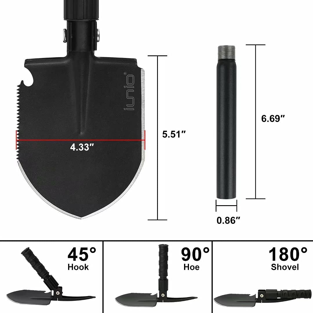 - Portable & Compact—This survival tool folds up and fits in a high-quality tactical waist pack with a belt loop to carry at your side. It’s easy for you to hang it on your belt to carry after the shovel folds up into small parts. The Iunio folding shovel lasts for life: our shovels are built to last! You take care of our shovel, and we’ll take care of you! All replacement requests are supported by our awesome customer service team anytime
